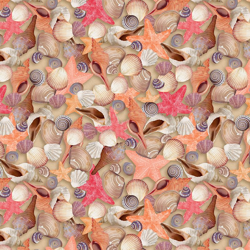 All Florida Shop Hop Sand, sea shells and starfish, salmon, cream, , conch, pink, neutral, white, mauve, purple.